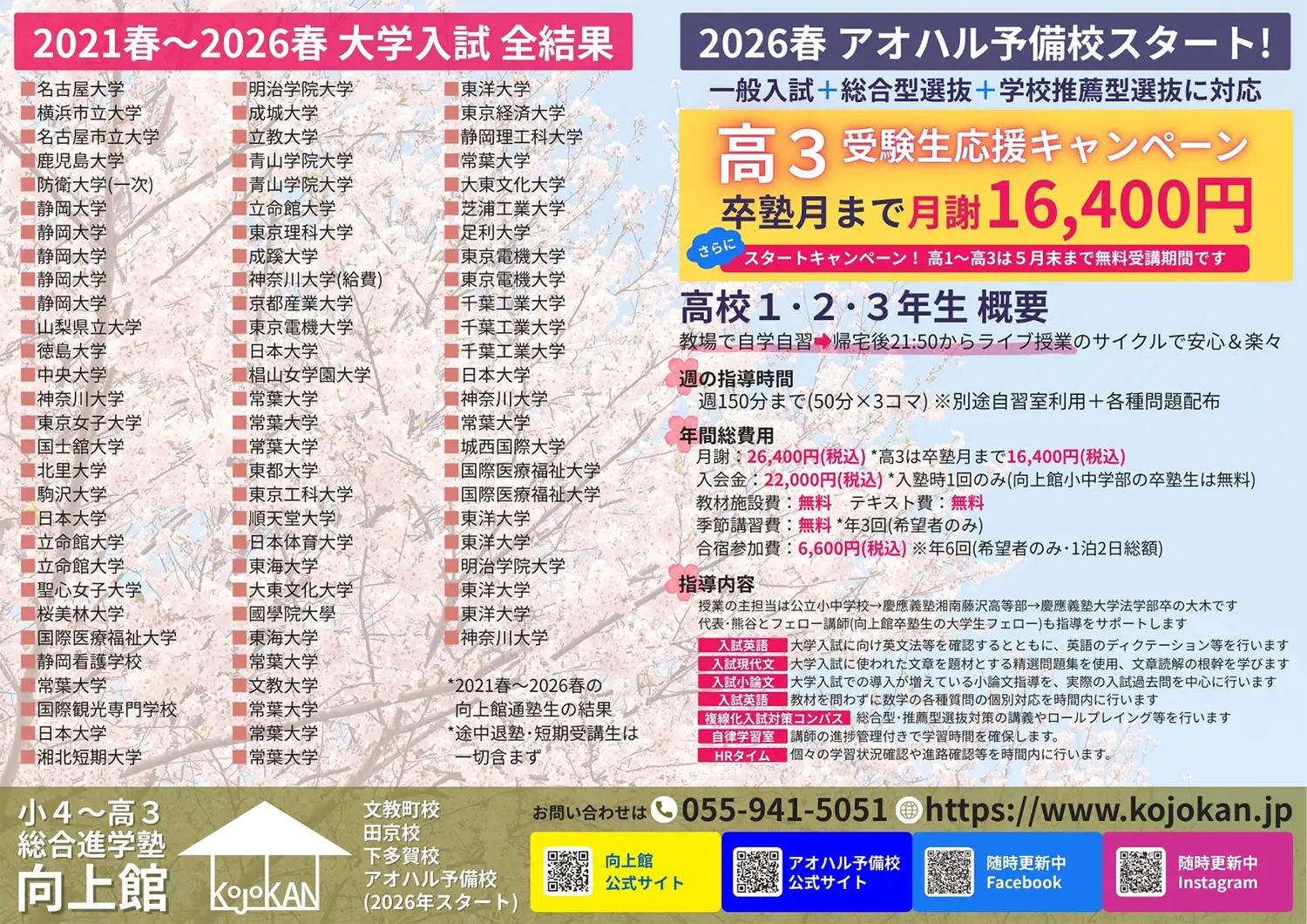 向上館&アオハル予備校です! 直近6年の大学入試・高校入試の全結果を公開!全5枚のバナーをご覧くだ